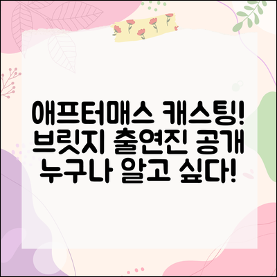 이처럼 요약된 출연진 정보를 제공하면, 시청자들이 더 잘 준비할 수 있고, 애프터매스 브릿지와 더욱 친숙해질 수 있습니다. 지금부터라도 시즌별 출연진을 간편하게 정리하여 확인해 보세요.
